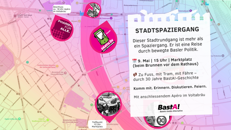 Die Route ist nicht gänzlich barrierefrei (steiler Anstieg am Rheinsprung). Melde dich gerne bei uns, um Bedarfe anzumelden, die dir die Teilnahme an unseren Veranstaltungen ermöglichen oder erleichtern. Wir werden uns bemühen, geeignete Massnahmen zu treffen. Bitte kontaktiere uns hierzu per E-Mail: sekretariat@basta-bs.ch