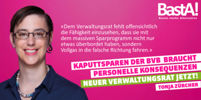 Das Fraktionsbündnis Grüne BastA! nimmt Stellung zum Bericht der Geschäftsprüfungskommission zu den Basler Verkehrsbetrieben. Tonja Zürcher erklärt im Fraktionsvotum, dass es nicht nur eine neue Eignerstrategie braucht, sondern auch einen Verwaltungsrat, der den Fokus auf die Anliegen des Personals und der Bevölkerung legt. Es müssen personelle Konsequenzen gezogen werden.