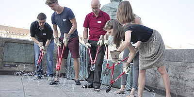 Mit einer deutlichen Aktion startete das Bündnis am 16. August seinen Wahlkampf, indem ParteivertreterInnen die in Stacheldraht eingekleidete Helvetia bei der Mittleren Brücke mit Bolzenschneidern befreiten.